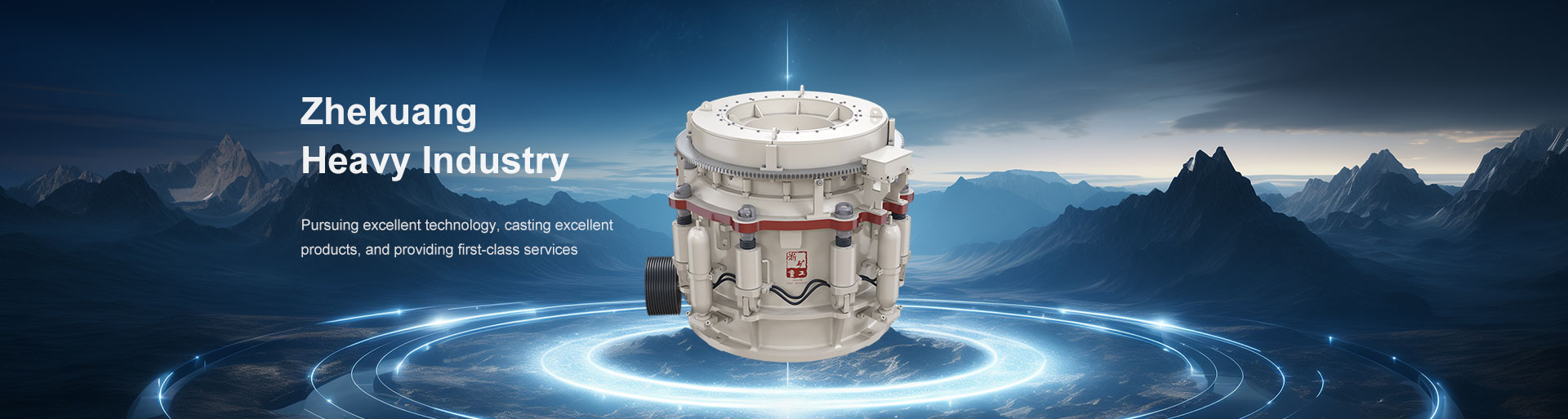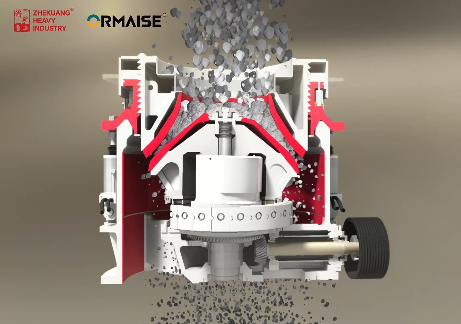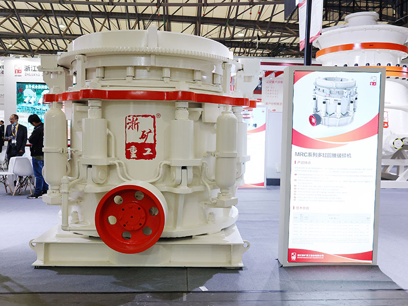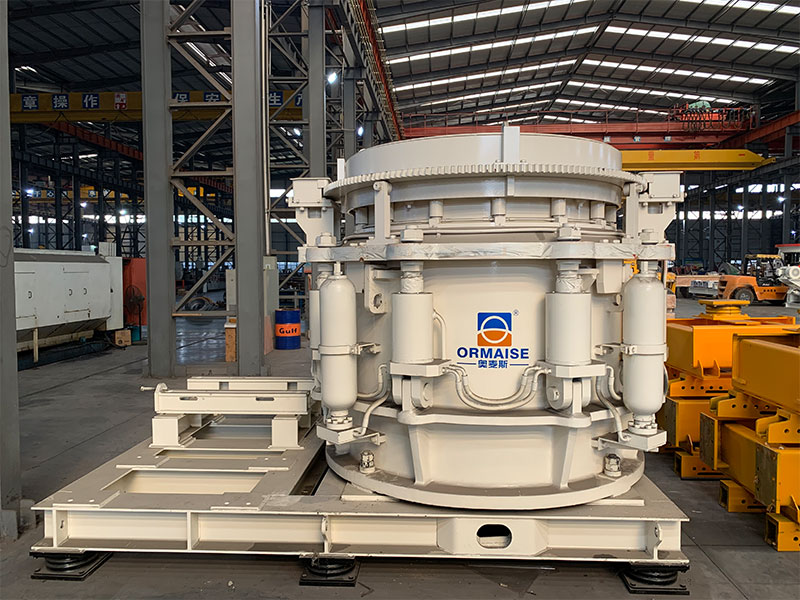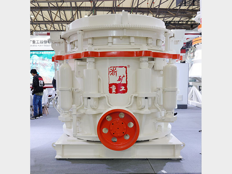 多缸液壓圓錐式破碎機(jī)工作時動錐沿著內(nèi)部偏心軸做旋擺運(yùn)動,靠近定錐的地方,物料受到動錐的擠壓和彎曲而破碎,偏離動錐的地方,已破碎的物料由于重力作用從錐底下落,整個破碎和排料過程沿著定錐和動錐之間的破碎腔連續(xù)依次進(jìn)行。機(jī)體外圍均勻分布若干液壓油缸和蓄能器,結(jié)合閥和管路起到過鐵保護(hù)和清理破碎腔的作用。